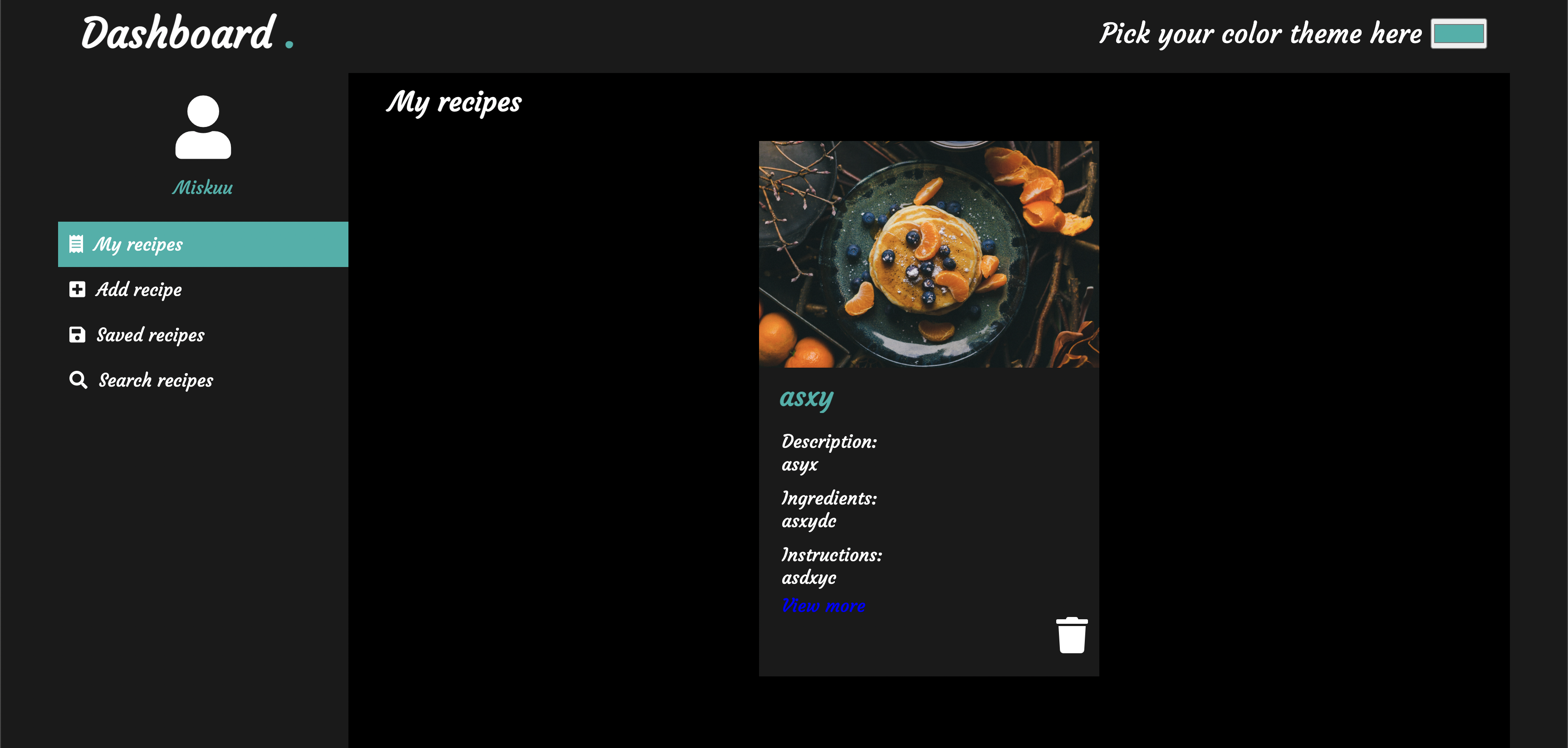 Click blick!!A web app created with the help of recipe api for keeping a record of your recipes for cooking. Open the link below and start adding your own recipes. Once you open the link and navigate through the page, it's pretty simple to add your files and texts to note/add down your recipes